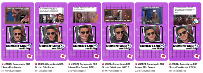 Com uma base de mais de 112 mil inscritos! Eldo Gomes oferece uma visão abrangente e envolvente das últimas novidades da casa mais vigiada do Brasil. São vídeos no YouTube Shorts diários com novidades e opinião do BBB24.