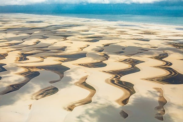 Outro modo de contemplar o espetáculo natural é pelo céu. Por isso vale a pena agendar um passeio de monomotor e observar de cima a grandiosidade da região, com suas formações de areia de um lado, o mar do outro e o Rio Preguiças, que nasce no município de Santana do Maranhão e deságua no Oceano Atlântico. Não se sabe ao certo a origem do nome do rio, mas alguns moradores defendem que ele foi batizado assim por causa da enorme quantidade de bichos-preguiça que havia ali no passado. Outros acreditam que foi por sua correnteza lenta e calma. O fato é que os bichos-preguiça nem sempre dão as caras por ali.