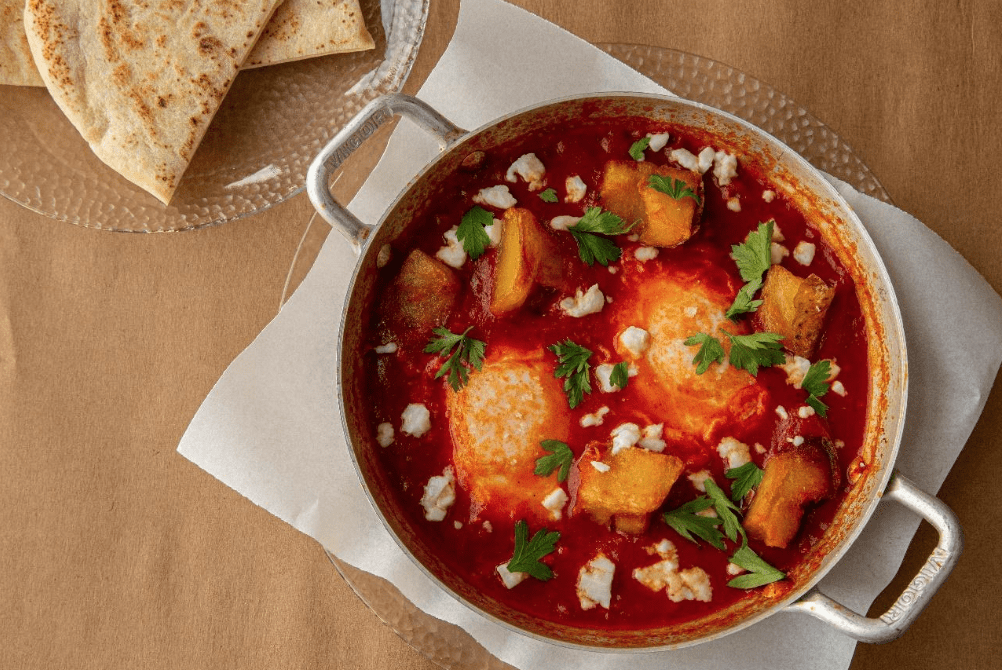 Executada pela chef Erika Kaiser, a shakshuka é servida em quatro versões: tripoli (dois ovos escalfados em molho picante, com espinafre), magreb (com berinjela defumada, amêndoas e coentro), berber (batatas douradas, queijo feta e salsinha) e benghazi (almôndegas bovinas condimentadas, salsinha, hortelã e limão).