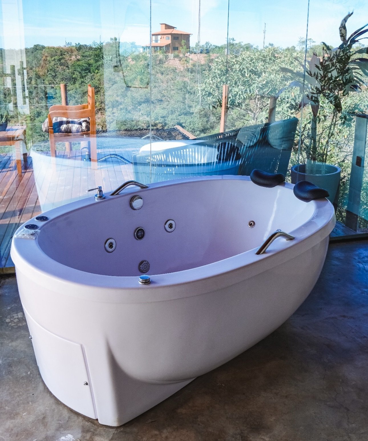 Entre os destaques, estão o ofurô com cromoterapia e jatos de água, perfeito para relaxar sob o céu do cerrado, e a sauna seca com paredes de vidro, que proporciona uma imersão única no ambiente natural. Para completar a experiência, uma ducha externa e um espaço integrado à mata garantem momentos ao ar livre com muito charme e autenticidade.