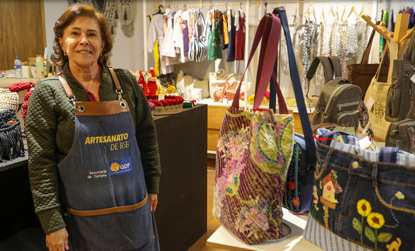 Outra artesã que está presente na unidade é Cristina Serafim, que confecciona bolsas e peças de vestuário com patchwork. “Sempre estou tentando fazer coisas diferentes, que fogem do tradicional, e que eu gosto. São coisas que eu também usaria”, afirma. Antes de 2022, quando obteve o registro junto à Setur-DF, as vendas ocorriam de modo informal. Agora, esta é a principal ocupação de Cristina. “A loja nos ajuda a divulgar nosso trabalho. O Natal é uma época boa de vender lembrancinhas para amigo oculto, peças de decoração. O comércio está aquecido e temos a oportunidade de ganhar um dinheirinho.”