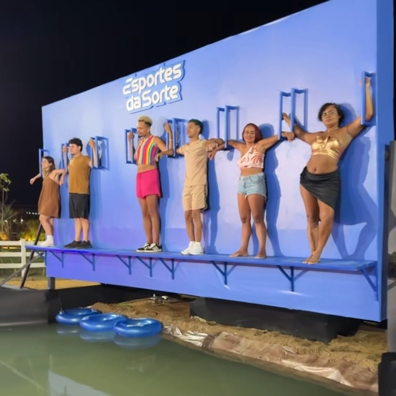 A competição, realizada em uma estrutura azul suspensa sobre um lago, exigiu dos participantes equilíbrio e força física.